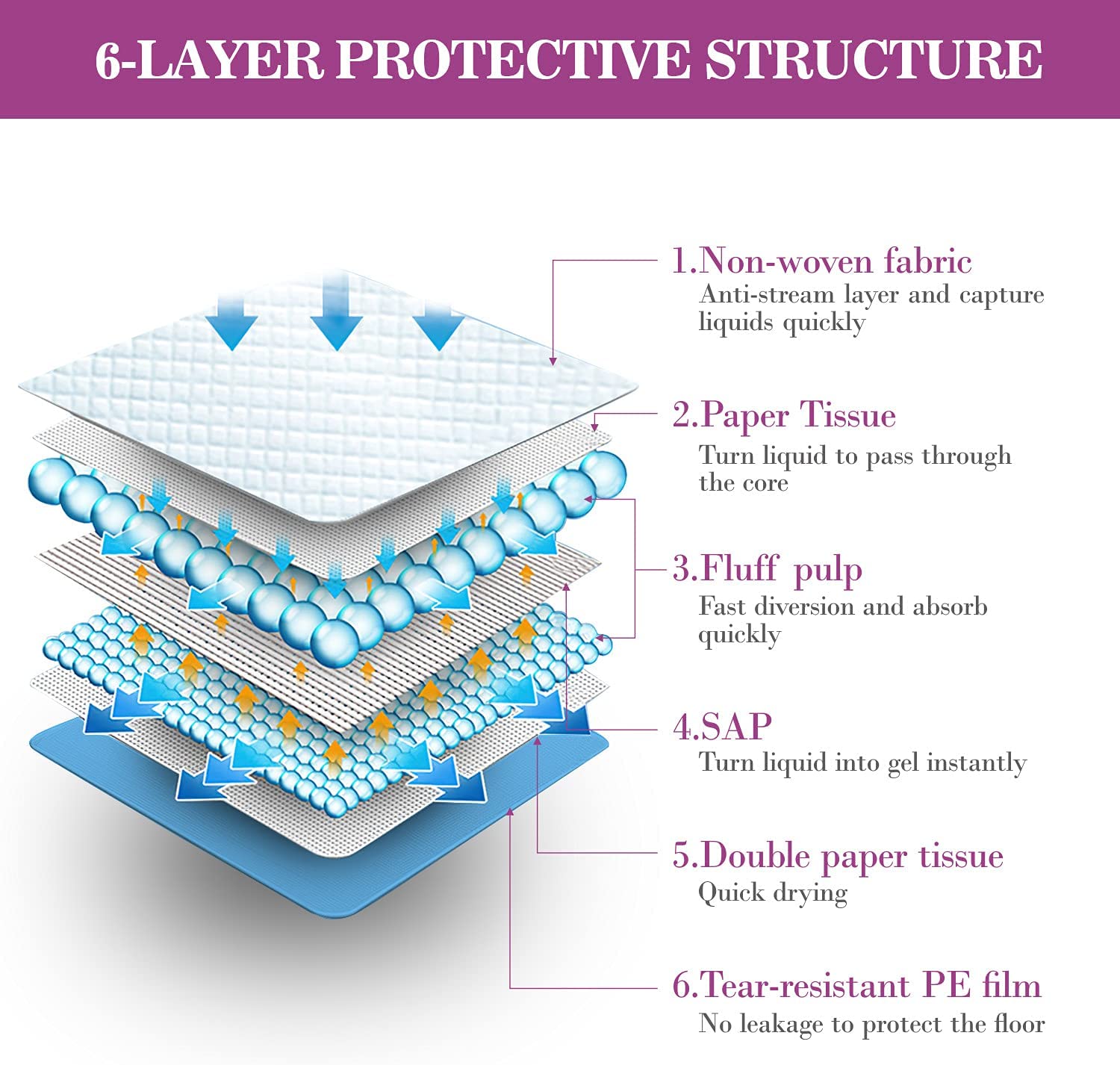 Super Absorbent:Thickened wee wee pads for dogs are made with 6 layers protection design,which makes our dog pee pee pads more absorbent than the most puppy potty pads on the market.