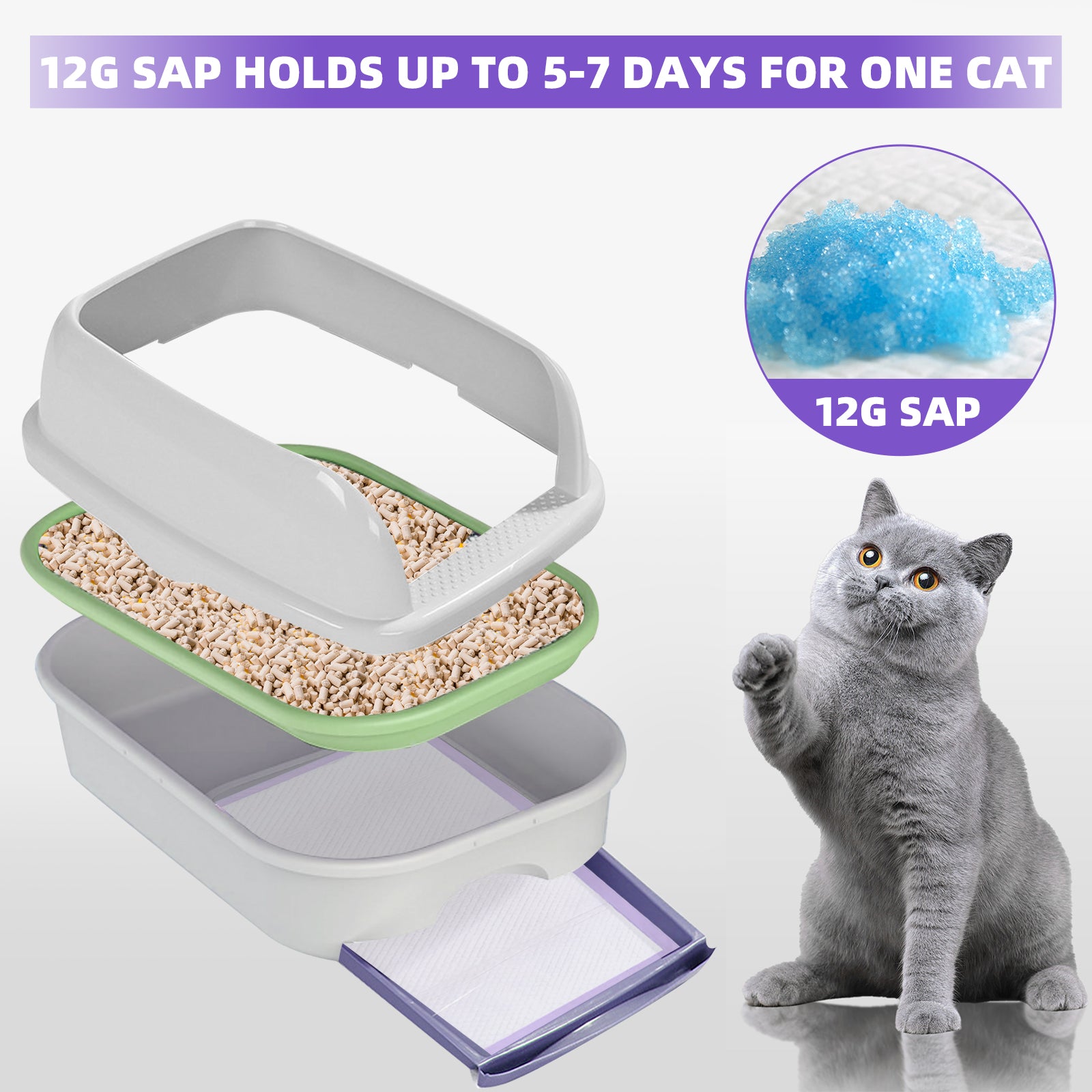 - đ¸ăSuper AbsorbentăCat litter pads have a 6-layer thickened design and a super absorbent SAP core to help absorb liquid better. Each pet pee pads for cats can absorb 5-7 days of urine for one cat and can hold up 12 cups of urine.